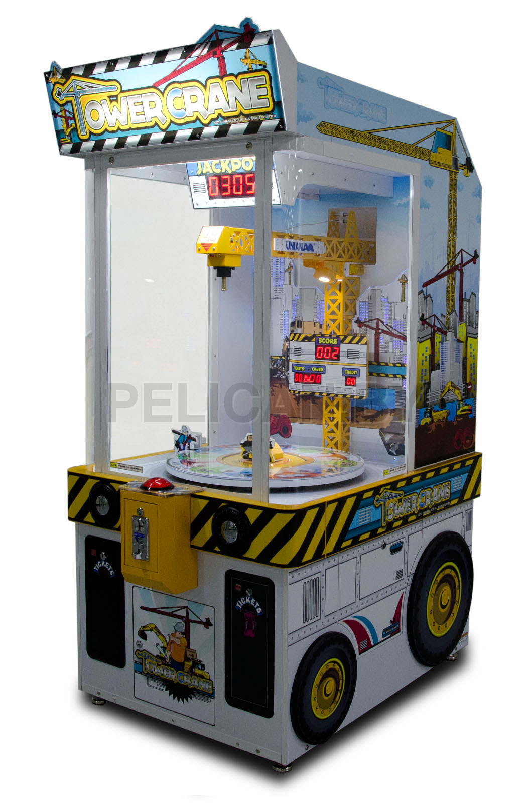 Нажатием на кнопку опустите трос со стрелы крана на игровое поле, в месте на которое он опустится будет указан Ваш выигрыш в билетиках.